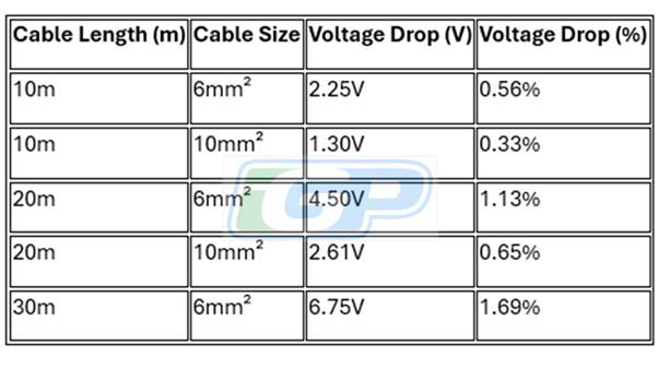 • 6mm² cable is sufficient for short to medium runs, but voltage drop increases significantly over longer distances.