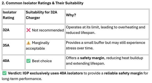 • For a 32A EV charger, a 40A isolator is essential for safety and durability.